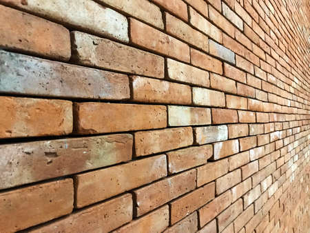 Fragment of brown brick wall with a shallow depth of field, at an angle to the plane. Selective focus.