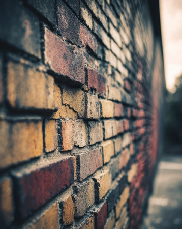 This image features a close-up view of a vintage red brick wall in an urban alleyway. The detailed texture presents a rustic look, complemented by a blurred background.