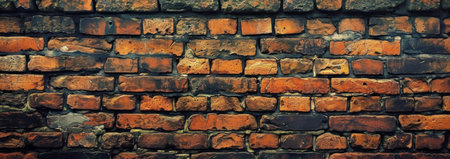 Detailed view at a colorful old and weathered brick wall texture. Panoramic background.