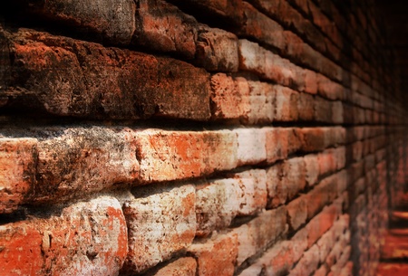 Red brick wall shot with the rows of bricks and grout fading into the distance.