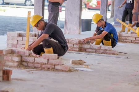 Besut, Malaysia - September 8th, 2020 : College students working brick wall construction in bricklaying workshop