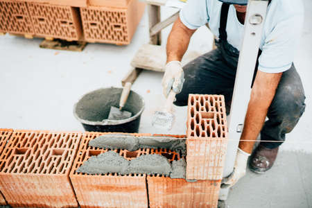 Professional bricklayer applying cement to red bricks at construction site for home building project