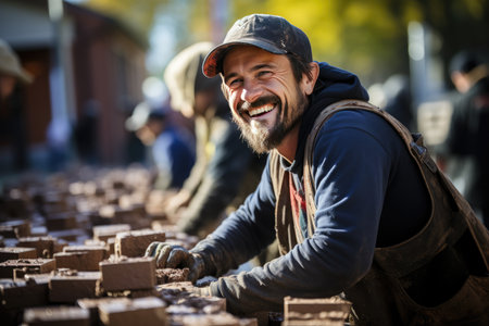 A construction worker happily laying bricks and carefully aligning them to build a sturdy wall taking pride in craftsmanship