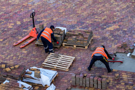 Two bricklayers renewing street - Workers adjusting the bricks on the sidewalk pavement