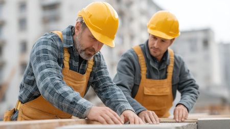 Two construction workers concentrate on their task, using tools to ensure accuracy in building amidst an urban landscape, showcasing dedication and teamwork.