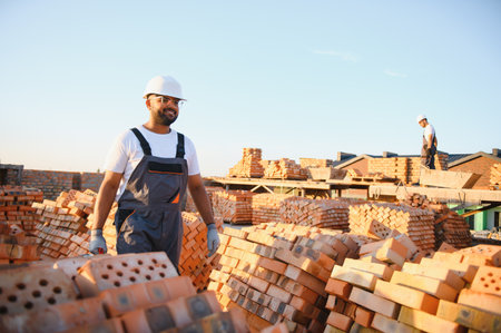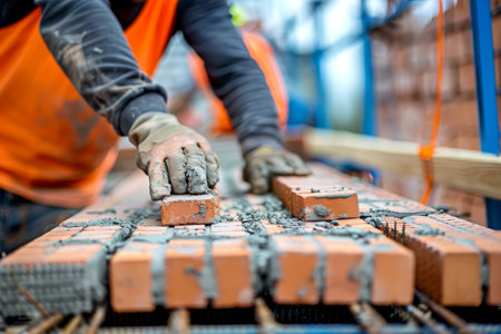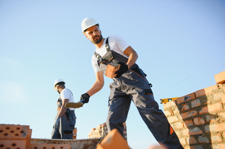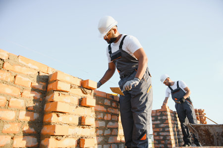 Skilled laborers expertly position vibrant red bricks, their protective gear ensuring safety as they construct a resilient structure under bright daylight.