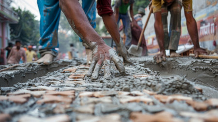 Hands of a dedicated worker skillfully position bricks in wet, muddy ground, shaping a pathway at a bustling construction site during early morning hours.