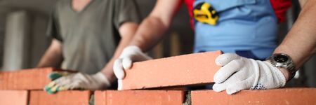 Close-up of builder laying brick with professional. Workmen at work, bricklayers building wall, contractor and worker. Masons using concrete and protective gloves