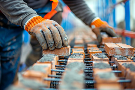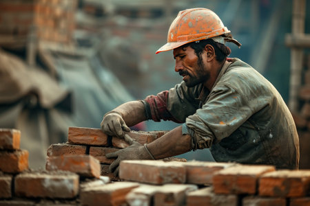 Construction worker wearing gloves and uniform carefully laying bricks on a wall symbol of hard work and craftsmanship.