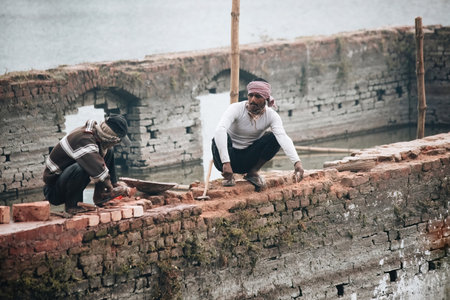 Two skilled construction workers labor intensively as they lay bricks to construct a solid wall.