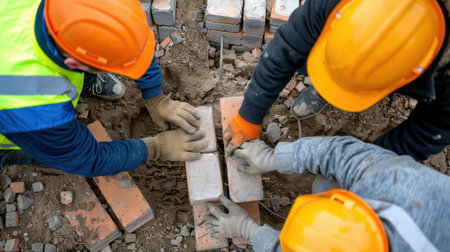 A group of construction workers wear safety gear while collaboratively laying bricks at a construction site. The image captures their teamwork and focus on quality craftsmanship.
