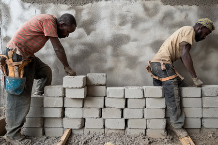 Two diligent workers focus on laying down concrete blocks, carefully aligning them to create a strong wall. The gritty atmosphere of the construction site surrounds them as they thoughtfully.