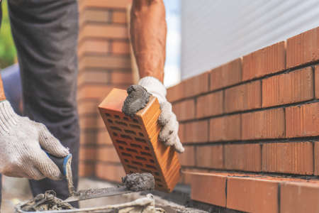 Builder worker laying solid clay brick, bricklaying