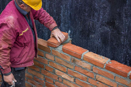 Bricklayer masonry installing red bricks in a new wall under construction.
