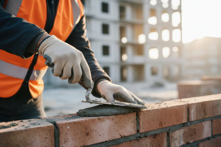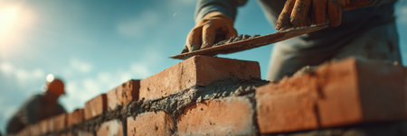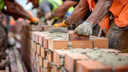 Skilled hands carefully lay bricks with mortar, forming a strong structure under sunlight in an active construction zone.