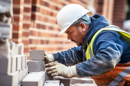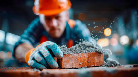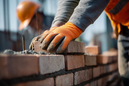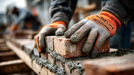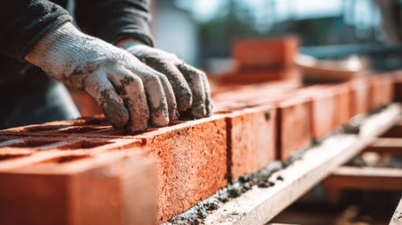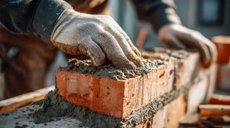 A diligent craftsman gloved hands position a vivid red brick onto fresh mortar, exemplifying craftsmanship and precision in building a resilient structure.