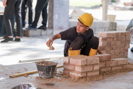 Besut, Malaysia - September 8th, 2020 : College students working brick wall construction in bricklaying workshop