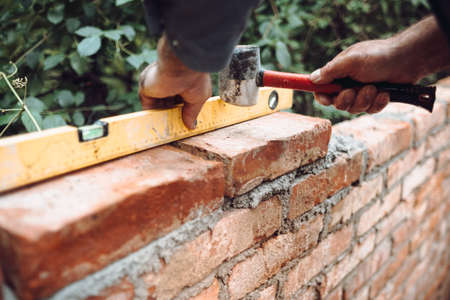industrial worker building exterior walls, using hammer and level for laying bricks in cement. Detail of worker with tools