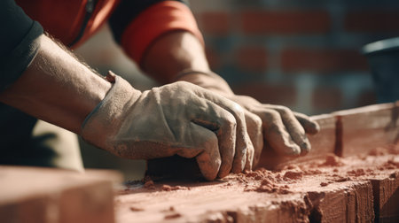 Close-up of construction worker's hands installing red bricks with mortar, detailed texture,