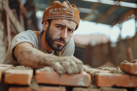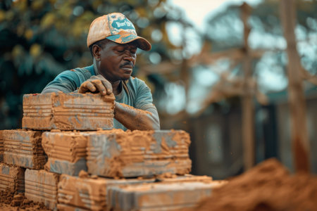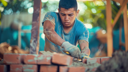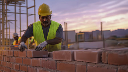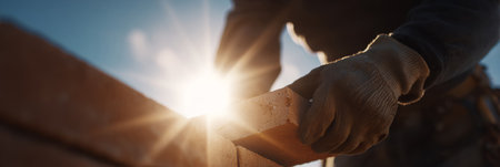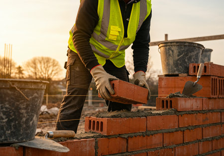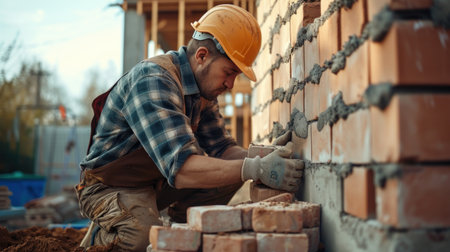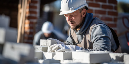 A construction worker carefully places bricks with precision on a building site. The sun shines brightly, illuminating the hard work involved in the masonry.