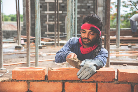 Happy Indian male construction worker constructing brick wall - hard working concept, manual labour