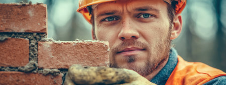 A construction worker inspects brick wall with focused expression, wearing orange safety helmet and vest, holding brick in his gloved hand