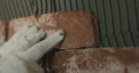 professional construction worker laying bricks and building brick walls in industrial site. Detail of hand adjusting bricks