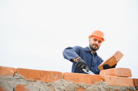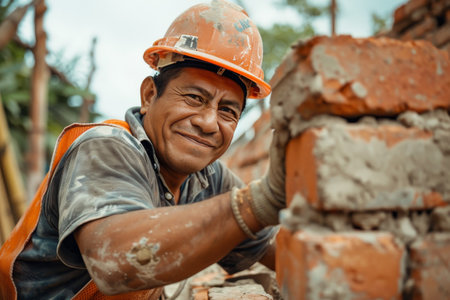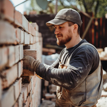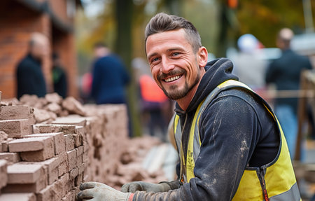 A construction worker happily laying bricks and carefully aligning them to build a sturdy wall taking pride in craftsmanship