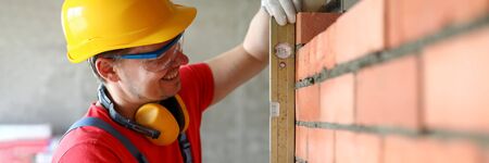 Close-up of bricklayer using spirit level to check new red brick wall. Professional worker in yellow helmet smiling at work. Construction site and renovation concept