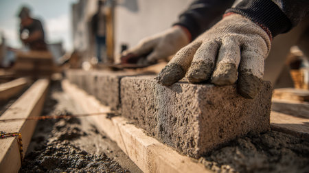 A focused worker with safety gloves arranges durable concrete units in precise alignment, applying mortar to create a solid base amid an open-air construction enviro
