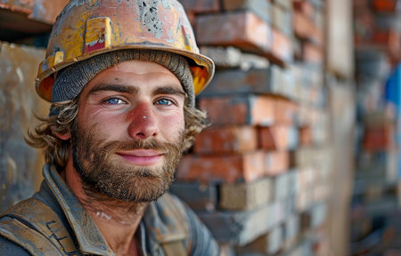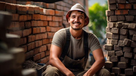 A joyful construction worker sits among bricks, showcasing a warm smile and dedication to his craft. The urban backdrop highlights community development.