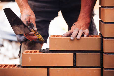 Bricklayer masonry installing red bricks in a new wall under construction.