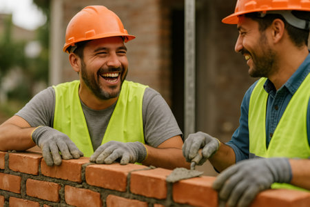 Two cheerful construction workers wearing safety helmets and vests are building a brick wall, laughing and enjoying their work