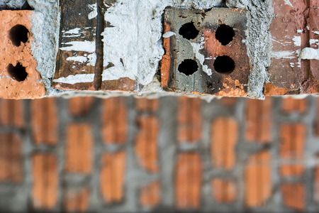 Background use a raw brick wall with red bricks and grey cement image with copy space