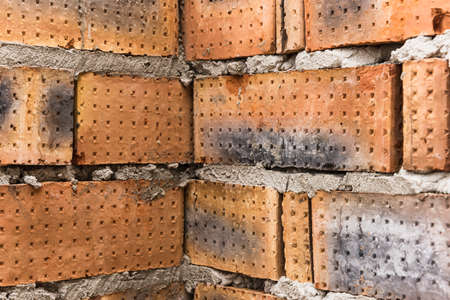 Side angle of a red brick wall corner. Close up view of cracked weathered brickwork material. Modern interior design, unique perspective. Loft like room style at home. Rusty facade architecture.