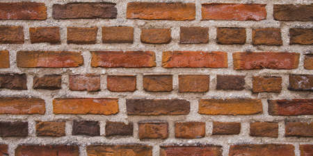Detailed view at a colorful old and weathered brick wall texture. Panoramic background.