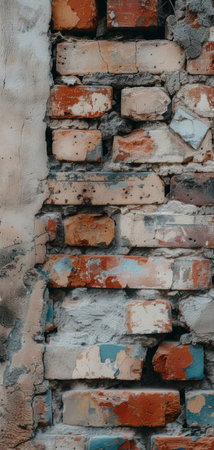 Detailed view of an old, damaged brick wall showing signs of age, erosion, and organic growth, creating a rustic and textured background