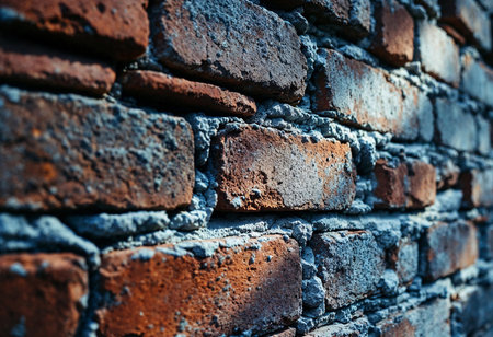 Natural daylight illuminates the close-up texture of a weathered brick wall, revealing layers of history and craftsmanship.