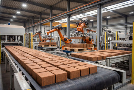 Rows of reddish brown clay pavers move along a conveyor belt while orange industrial robotic arms stack materials in the background of a modern manufacturing plant.