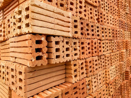 Close up pile new red brick with holes stacked in rows wall. Store of bricks ready for building or sale. Background Building Construction materials Texture, outdoor storage or manufacturing concept