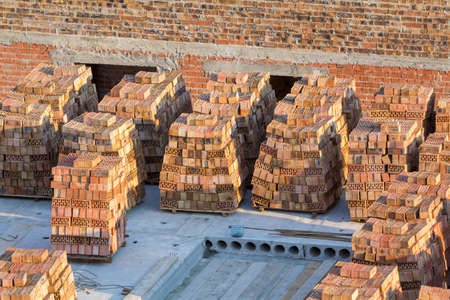 Raw brick laid out in stacks for drying. Bricks in a brick factory. Traditional production of clay bricks in India.