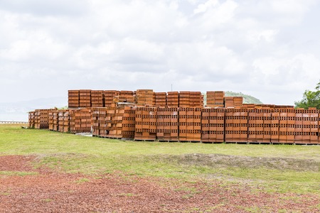 Just made red bricks stacked in several rows for sale