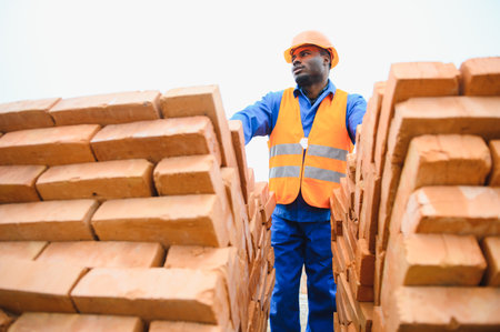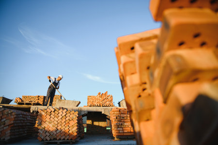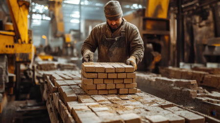 Industrial Worker Stacking Bricks in a Factory Setting