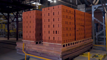 Plant for the production of bricks. Plant for production building material with ready brick, construction industrial. Production of bricks on plant. Workflow, close-up. Brick stacks. Many bricks