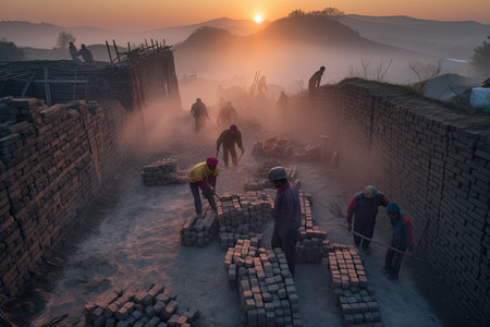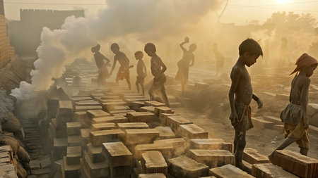 Silhouettes of children working in a dusty brickyard at sunset create a warm, hazy atmosphere with orange hues, embodying the toil of manual labor and challenges of industrial work