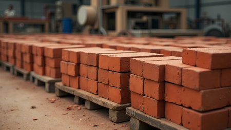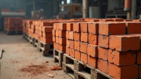 Vibrant red bricks on pallets in factory with dusty floor and machinery in background