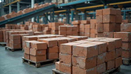 Neatly stacked industrial bricks on pallets in warehouse with conveyor belts