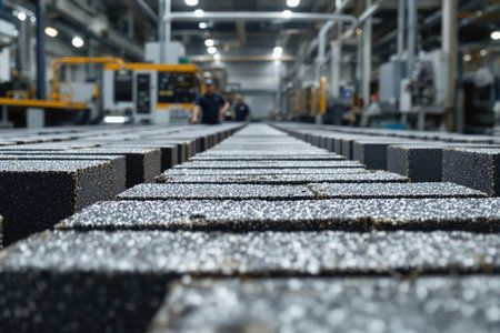 Uniformly aligned building blocks featuring intricate surface patterns and drilled openings, set against a backdrop of an active manufacturing environment.
