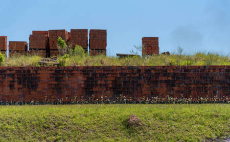 Masonry wall. Brick factory. Bricks stacked in paddle for transport. Pottery deposit.