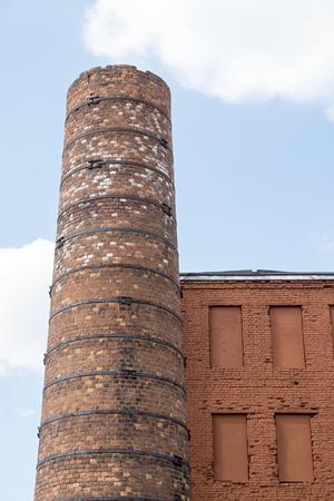 Tall red brick industrial smoke stack or chimney agianst blue sky